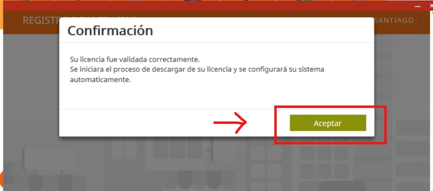 4. Una vez terminado, le saldra la ventana de "Confirmacion" donde indica que la licencia se descargo correctamente, Clic en "Aceptar"