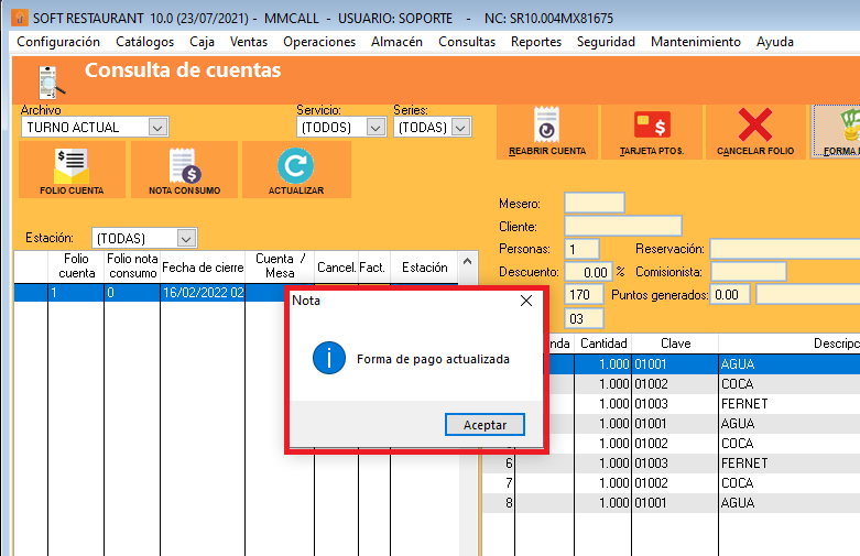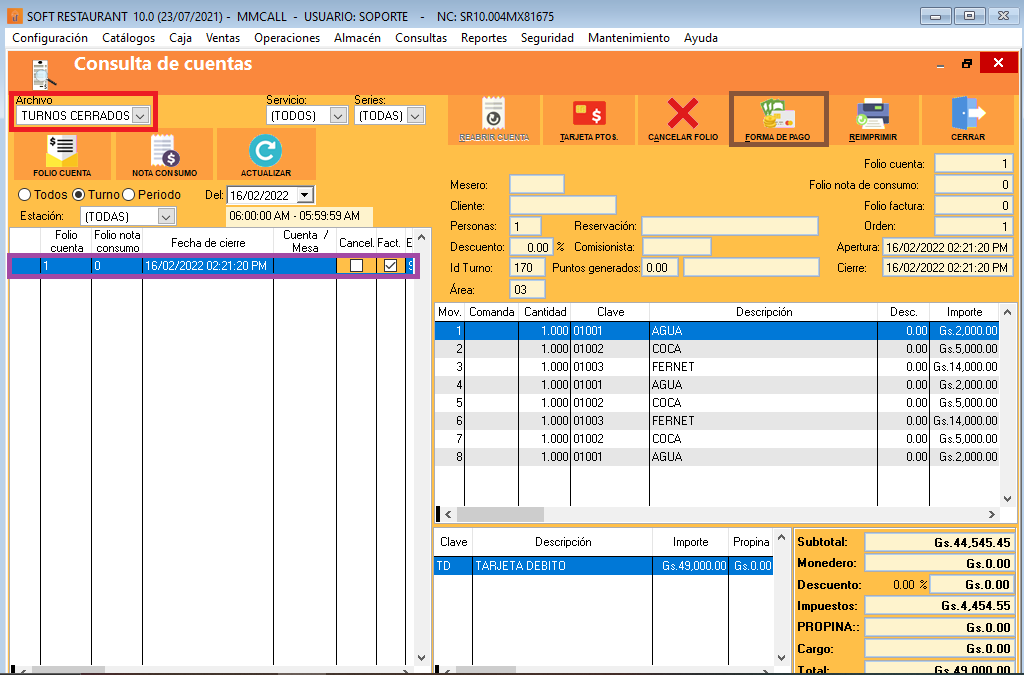 2. Nos dirigimos al botón Archivos y seleccionamos Turnos Cerrados, clic en el botón Actualizar para visualizar las cuentas.