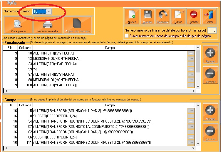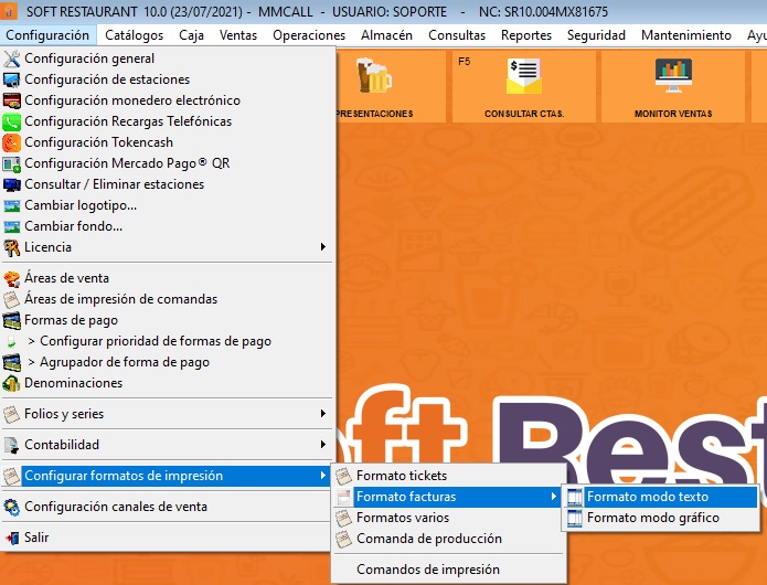 CONFIGURACIÓN → CONFIGURAR FORMATOS DE IMPRESION → FORMATO FACTURAS → FORMATO MODO TEXTO