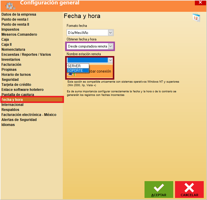 - Desde computadora local: El sistema tomará la fecha y la hora de la computadora donde se encuentra instalada.