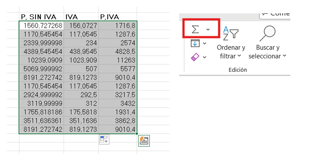 la autosuma de P. sin IVA / IVA / P. con IVA.