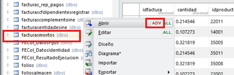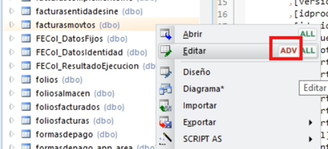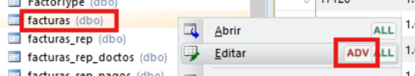- Nos dirigimos a Database4, click derecho en facturasmvtos → editar ADV.
