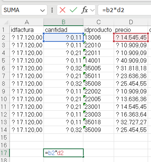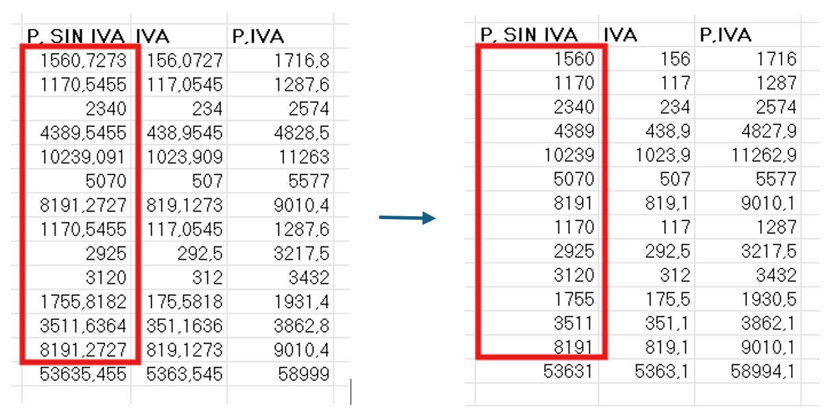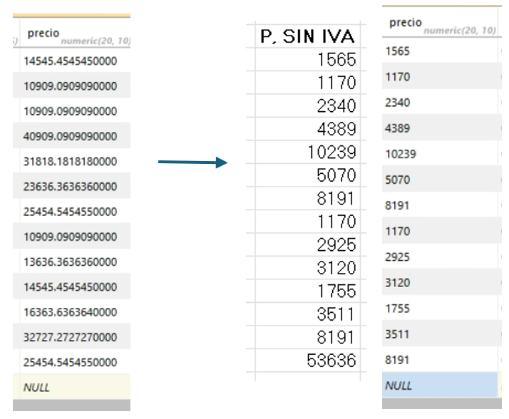 - En la columna de P. sin IVA convertimos los números con coma a enteros, para esto reescribimos en cada casilla solo la parte entera sin copiar lo que esta después de la coma.