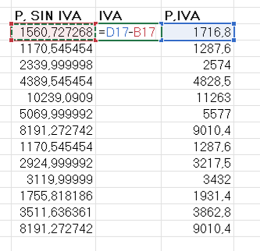 Restamos la columna P. con IVA menos P. sin IVA.