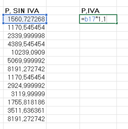 Realizamos la siguiente operación en otra casilla, multiplicamos la columna P. sin IVA por 1.1 escribiendo: =[casilla]*1.1, ejemplo: =B17*1.1 - Aplicar la fórmula a toda la columna.
