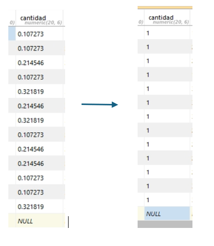- En la columna cantidad, cambiamos los valores a “1”