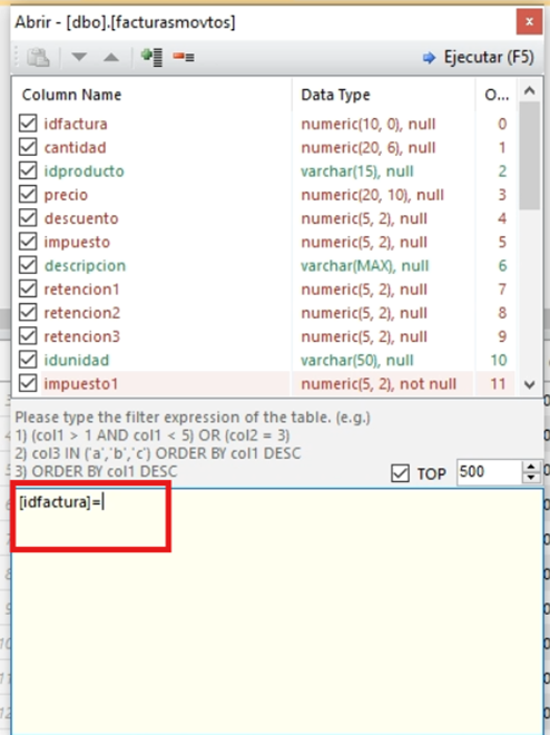 Escribimos: [idfactura]= numero de la factura, click en ejecutar (o F5).