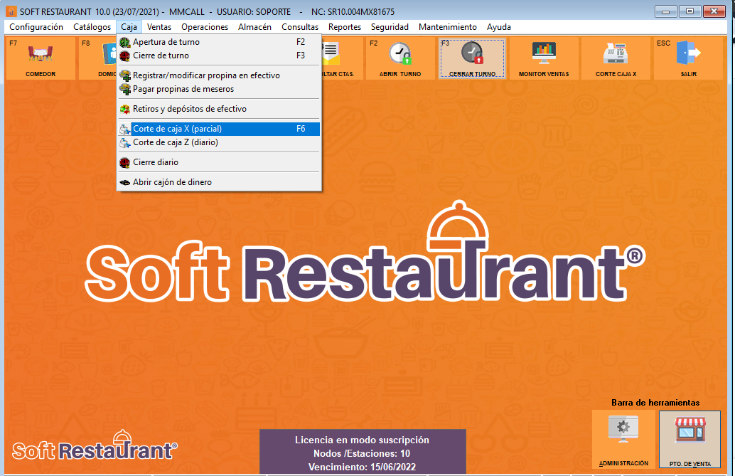 1. Seleccionamos la opción Caja seguido Corte de Caja Parcial X