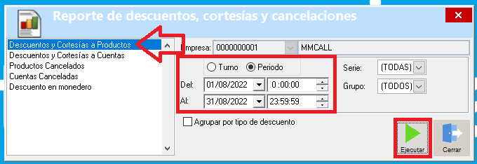 3. Seleccionamos desde que Día y Hora queremos el reporte de descuento y de que Grupo
