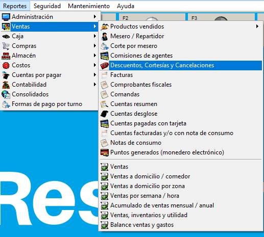 1. Clic en Reportes, Ventas y luego en Descuentos Cortesías y Cancelaciones.