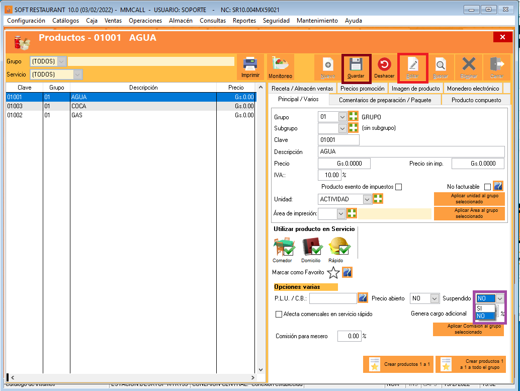 3. Seleccionamos el producto a suspender dando Doble Clic sobre el mismo, luego en el botón Editar.